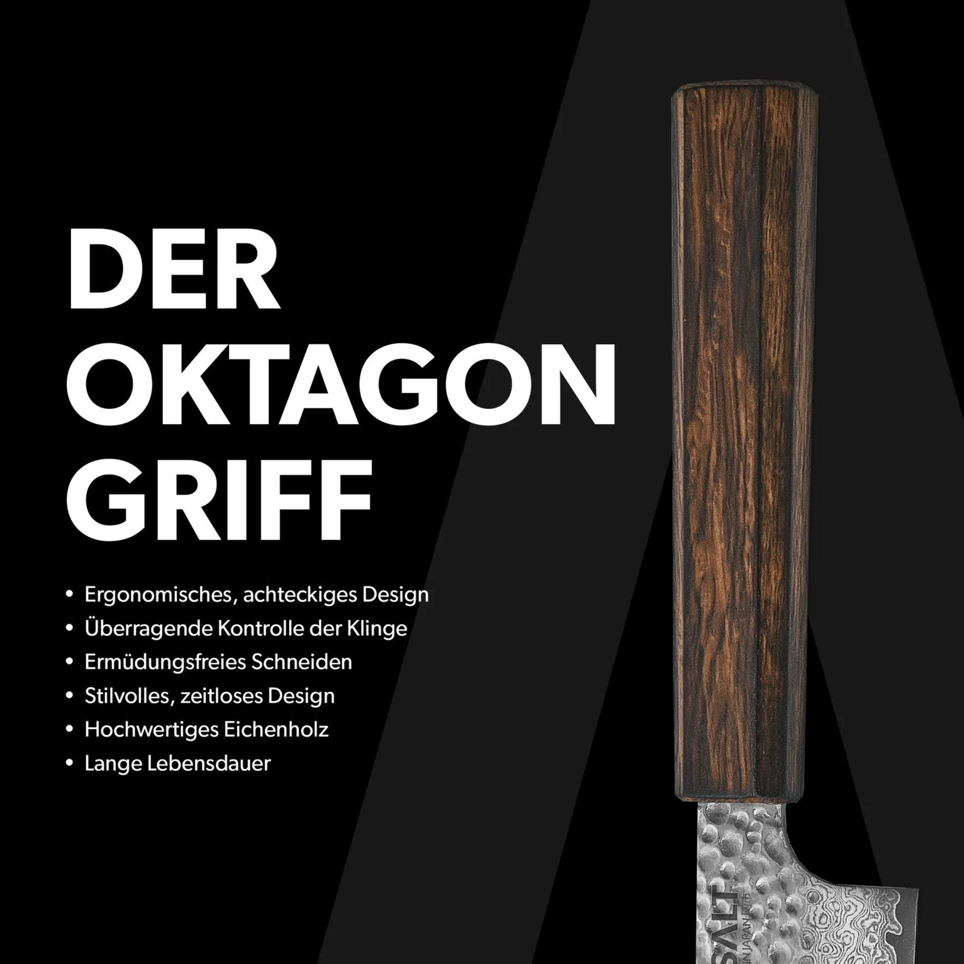 Der Oktagon-Griff aus edlem Eichenholz liegt ergonomisch in der Hand und sorgt für maximale Kontrolle bei jedem Schnitt. Durch das traditionelle Tsuchime-Hammerschlagmuster wird nicht nur das Anhaften von Lebensmitteln reduziert, sondern jedes Messer erhält auch seine unverwechselbare, handgefertigte Optik.