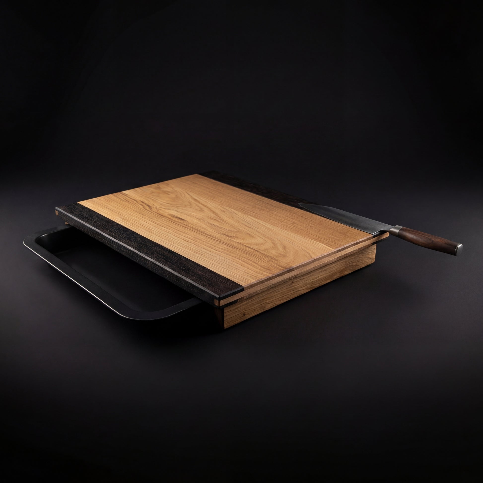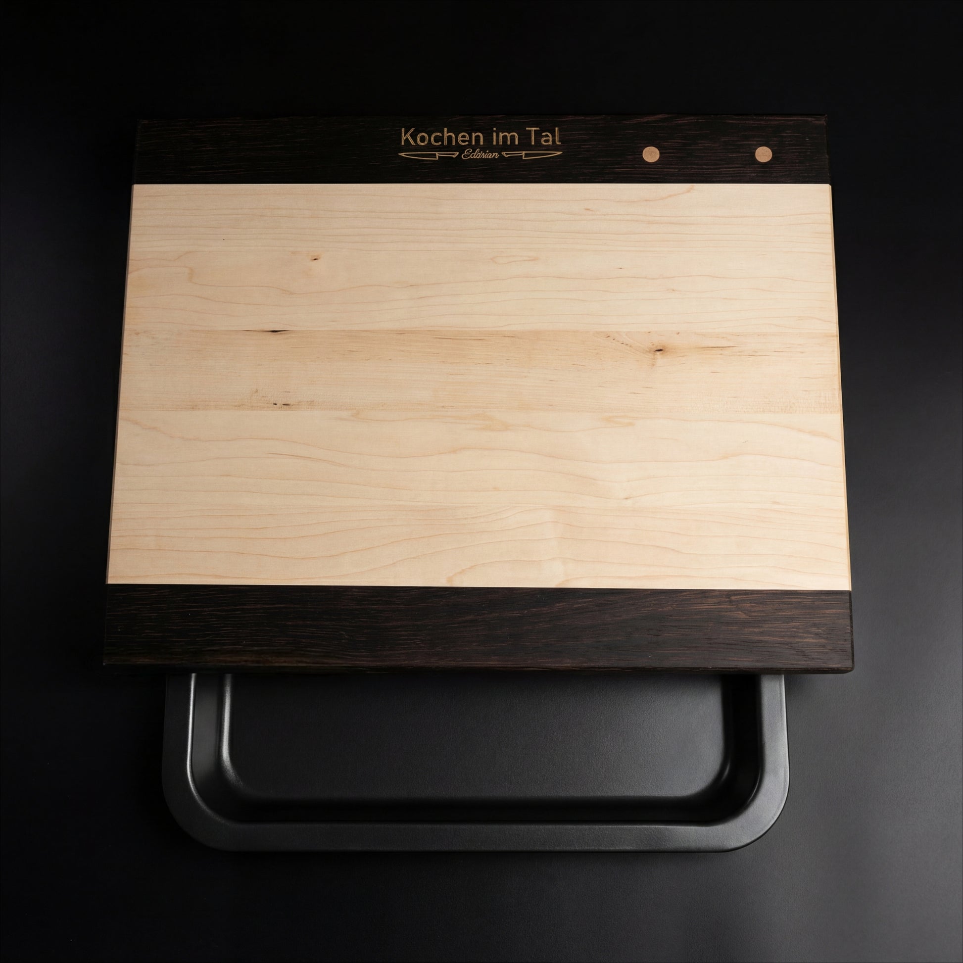Durch die präzise Verarbeitung aus Ahorn oder Eiche in Kombination mit seitlichen Wenge-Elementen entsteht nicht nur eine optisch edle Arbeitsfläche, sondern auch ein Schneidebrett, das Messerklingen schont und gleichzeitig höchste Stabilität bietet. Die integrierte Auffangschale ist backofengeeignet und ermöglicht ein sauberes, effizientes Arbeiten ohne zusätzliche Behälter.